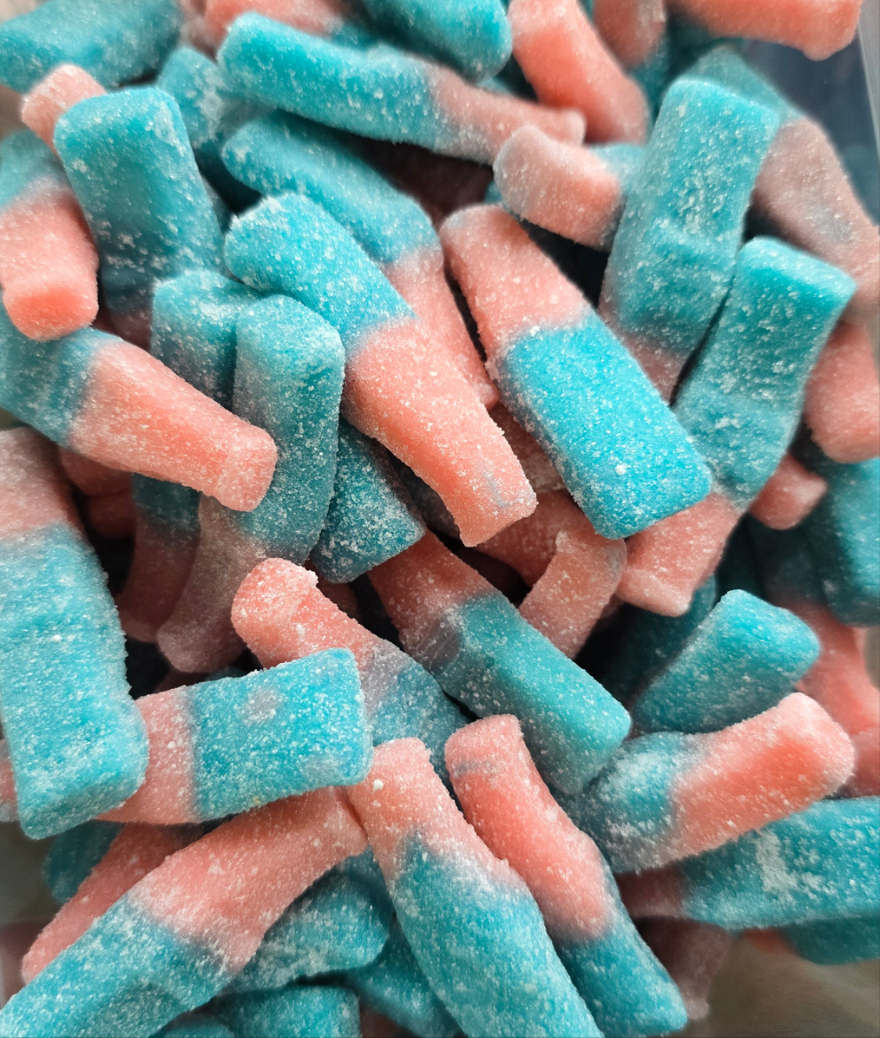 Sirop de glucose, sucre, eau, gélatine de boeuf, amidon modifié de maïs, acidifiants : E270, E330, E296, dextrose, arômes, colorants : E133, E129, agent d'enrobage : cire de carnauba.