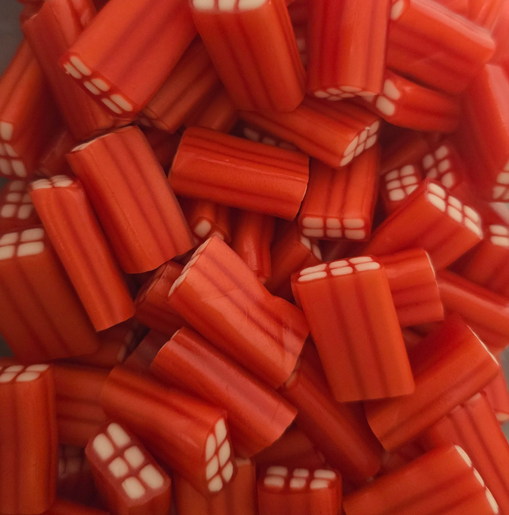 Sirop de glucose-fructose, sucre, amidon, farine de blé (gluten), sirop de sucre inverti, eau, acidifiants (E330), amidon de pomme de terre, maltodextrine, humectant (E422), correcteur d'acidité (E332), graisse végétale (palme), gélatine de bœuf halal, arôme artificiel, colorant (E129), agents d'enrobage (huile végétale: palme), émulsifiant (E322).