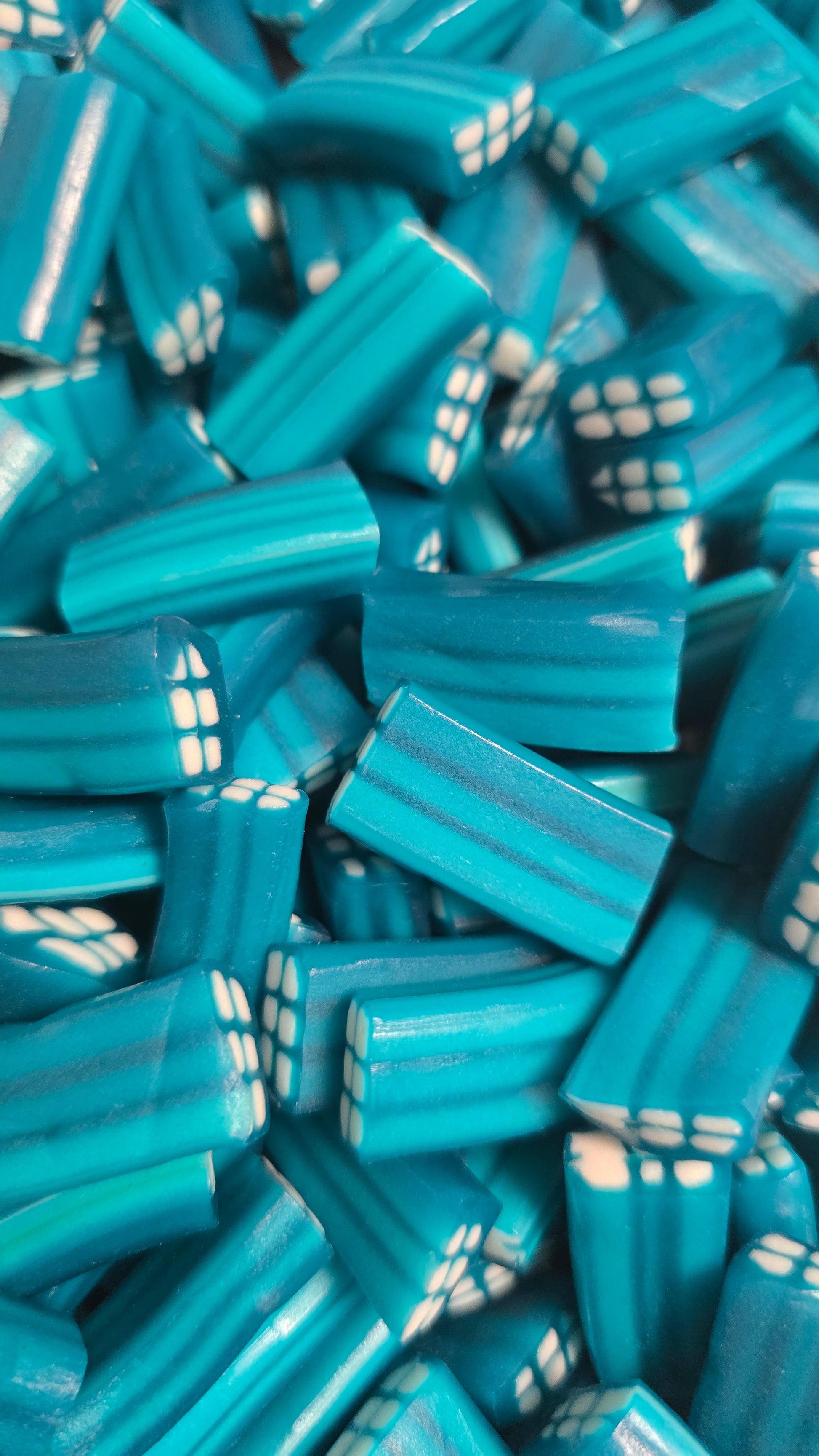 Sirop de glucose-fructose, sucre, amidon, farine de blé (gluten), sirop de sucre inverti, eau, acidifiants (E330), amidon de pomme de terre, maltodextrine, humectant (E422), correcteur d'acidité (E332), graisse végétale (palme), gélatine de bœuf halal, arôme artificiel, colorant (E133), agents d'enrobage (huile végétale: palme), émulsifiant (E322).