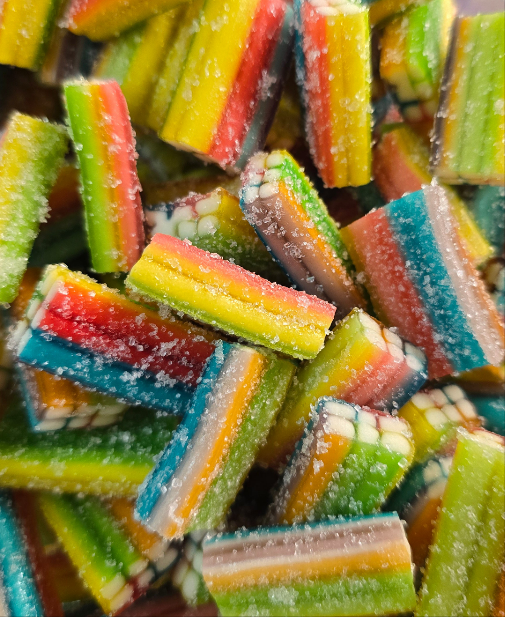 Sirop de glucose-fructose, sucre, amidon, farine de blé (gluten), sirop de sucre inverti, eau, acidifiants (E330, E296), dextrose, amidon de pomme de terre, maltodextrine, humectant (E422), correcteur d'acidité (E332), graisse végétale (palme), gélatine de bœuf halal, arôme artificiel, colorants (E102, E110, E129, E133), agents d'enrobage (monostéarate de glycérol (tournesol, E471)), huile végétale (coco, karité), émulsifiant (E322).