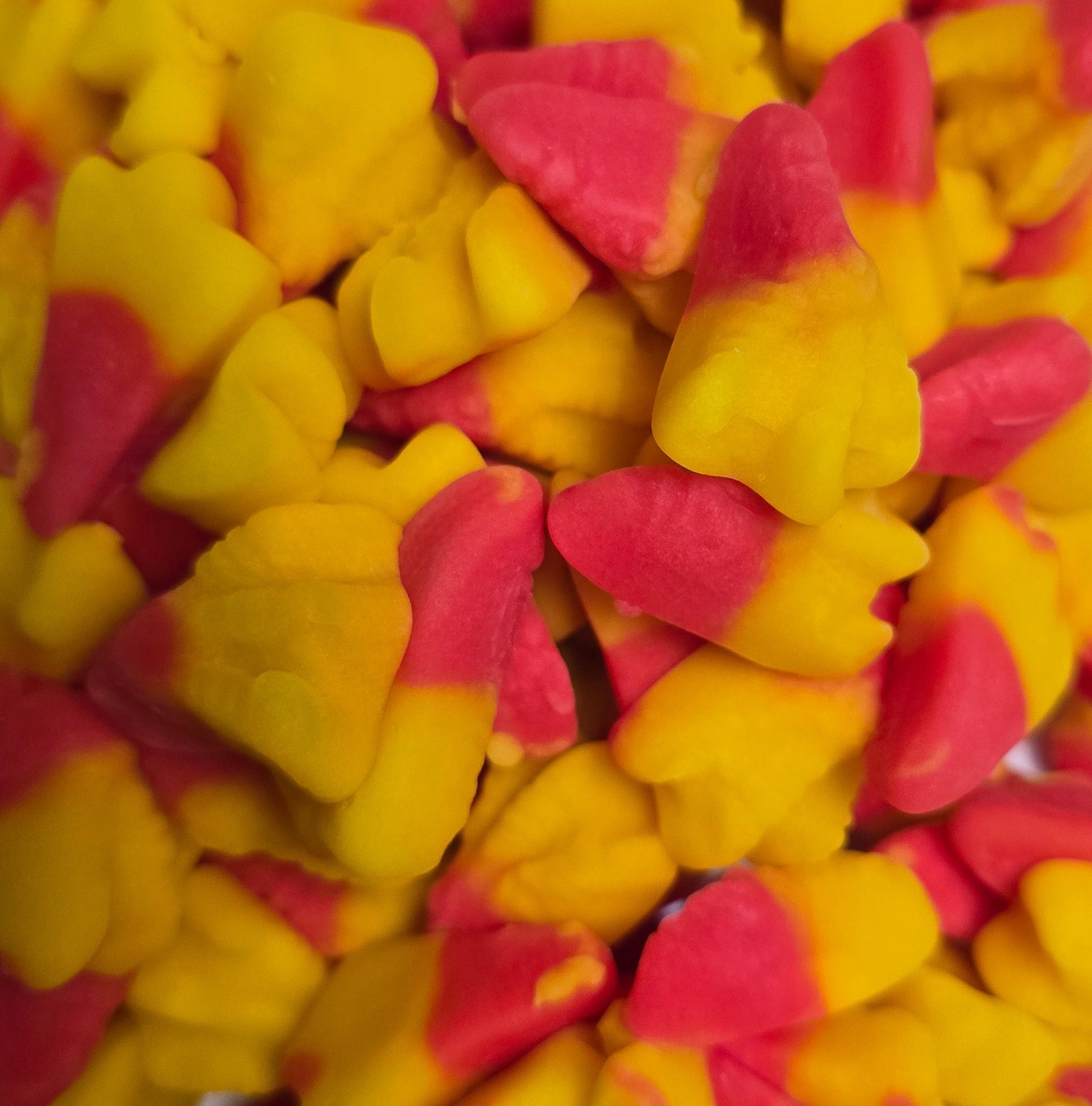 Sirop de glucose, sucre, eau, amidon, gélatine de bœuf halal, dextrose, acidifiants (E270, E330), agent d'enrobage (huile végétale : palme, E901, E903), arôme artificiel, colorants (E102, E129).