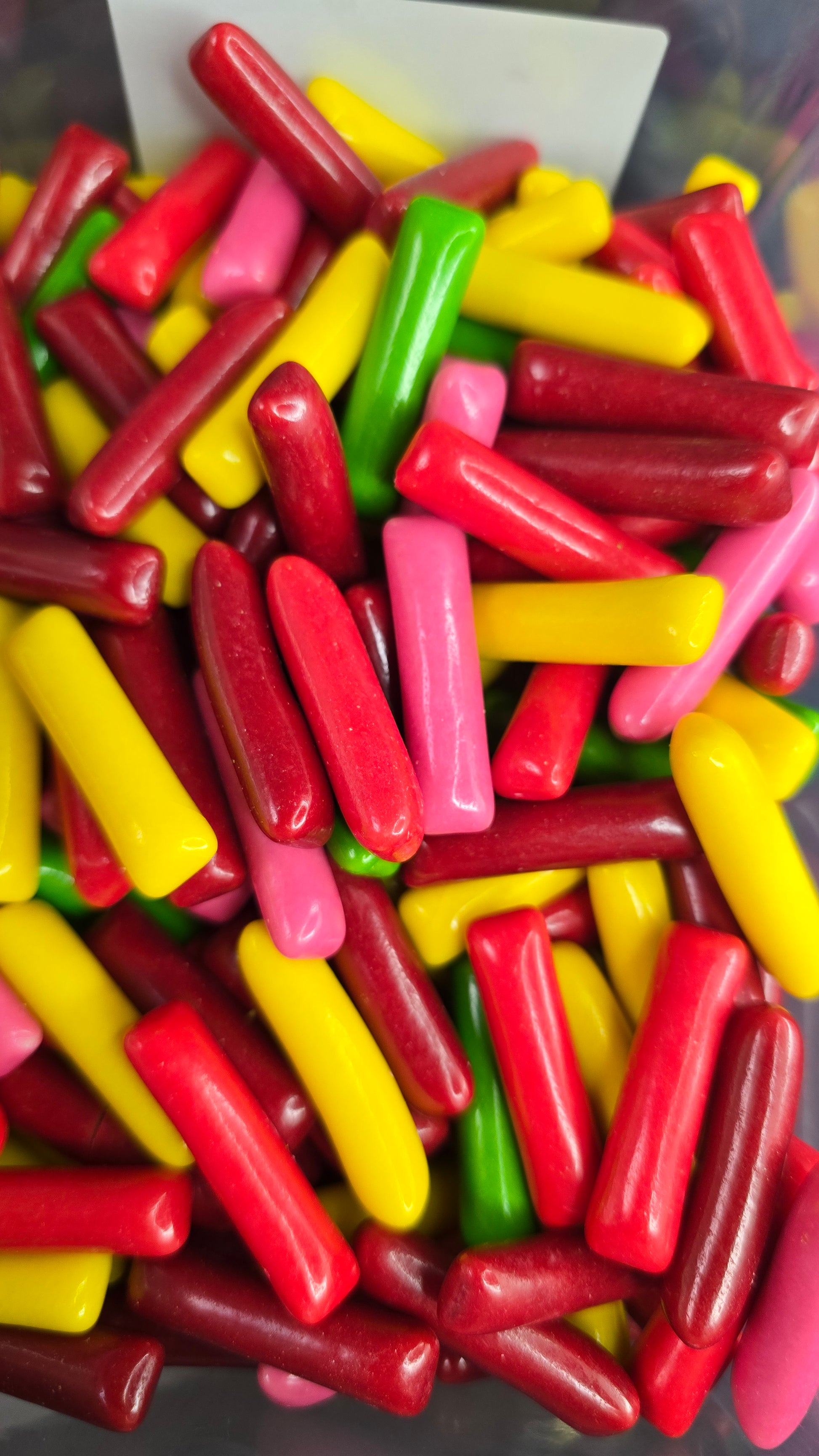 Sucre, sirop de glucose, dextrose, graisse de palme, 5% jus de fruits concentré (pomme, pêche, citron, fraise, framboise), gélatine (gélatine bovine), stabilisant: gomme arabique, amidon modifié, acidifiants: acide lactique, acide citrique, arômes, émulsifiant: lécithines, colorants: cochenille, curcumine, bleu brillant FCF, charbon végétal médicinal, agents d 'enrobage: cire de carnauba, shellac, cire d 'abeille blanche et jaune.