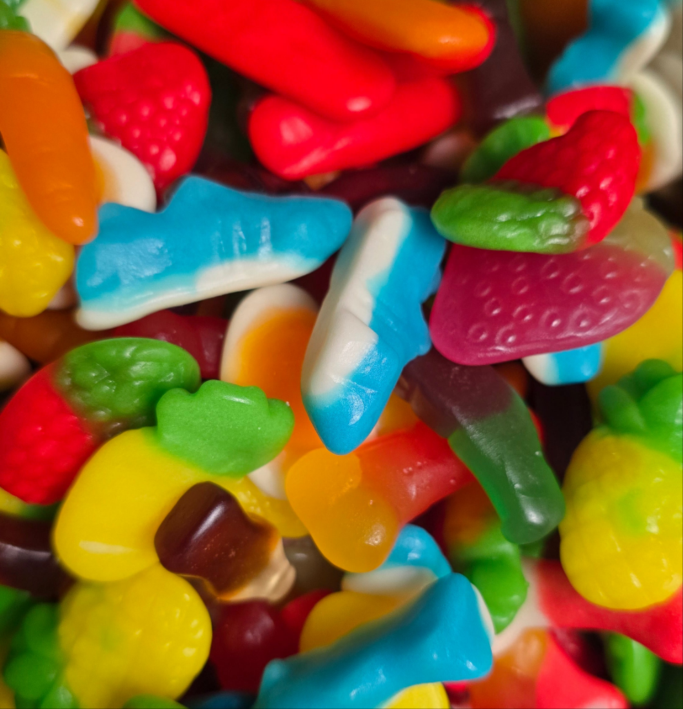 Sirop de glucose, eau, sucre, amidon, gélatine de boeuf, acidifiant : acide citrique, régulateur d'acidité : citrate de sodium, agent d'enrobage : cire de caranuba, colorants : E100, E102, E129, E133.