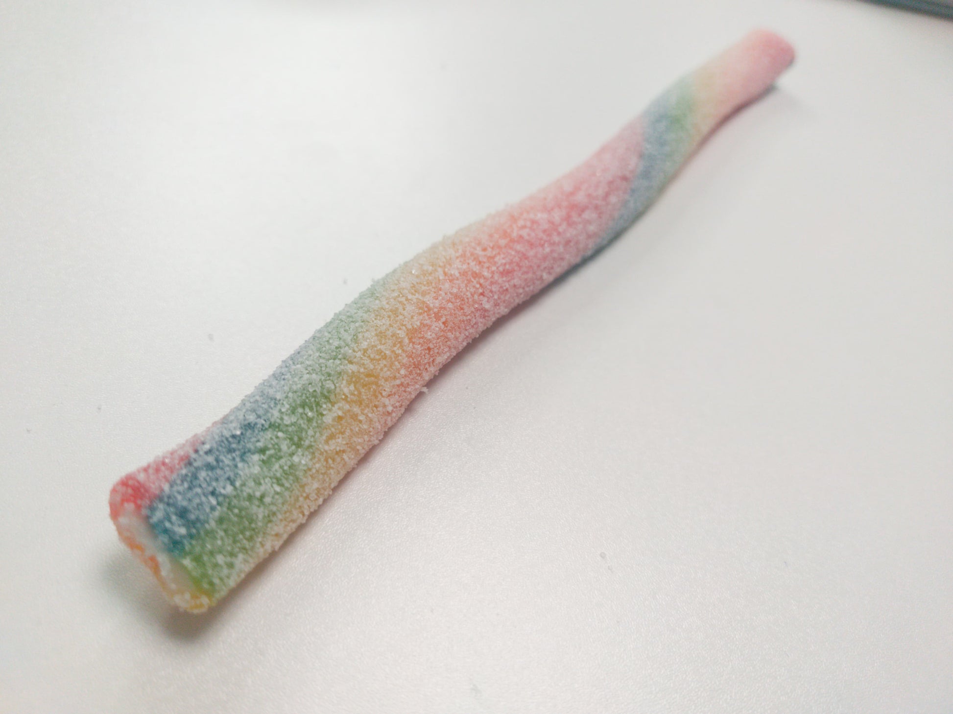 Sucre, sirop de glucose et de fructose, farine de blé (gluten), amidon, acidifiant (E296), graisse végétale (palme), gélatine, acidifiant (E270, E331), arôme, correcteur d'acidité (E325, E331), sel, émulsifiant (E471), humectant (E422), colorant E102, E129, E133, E110, E129
