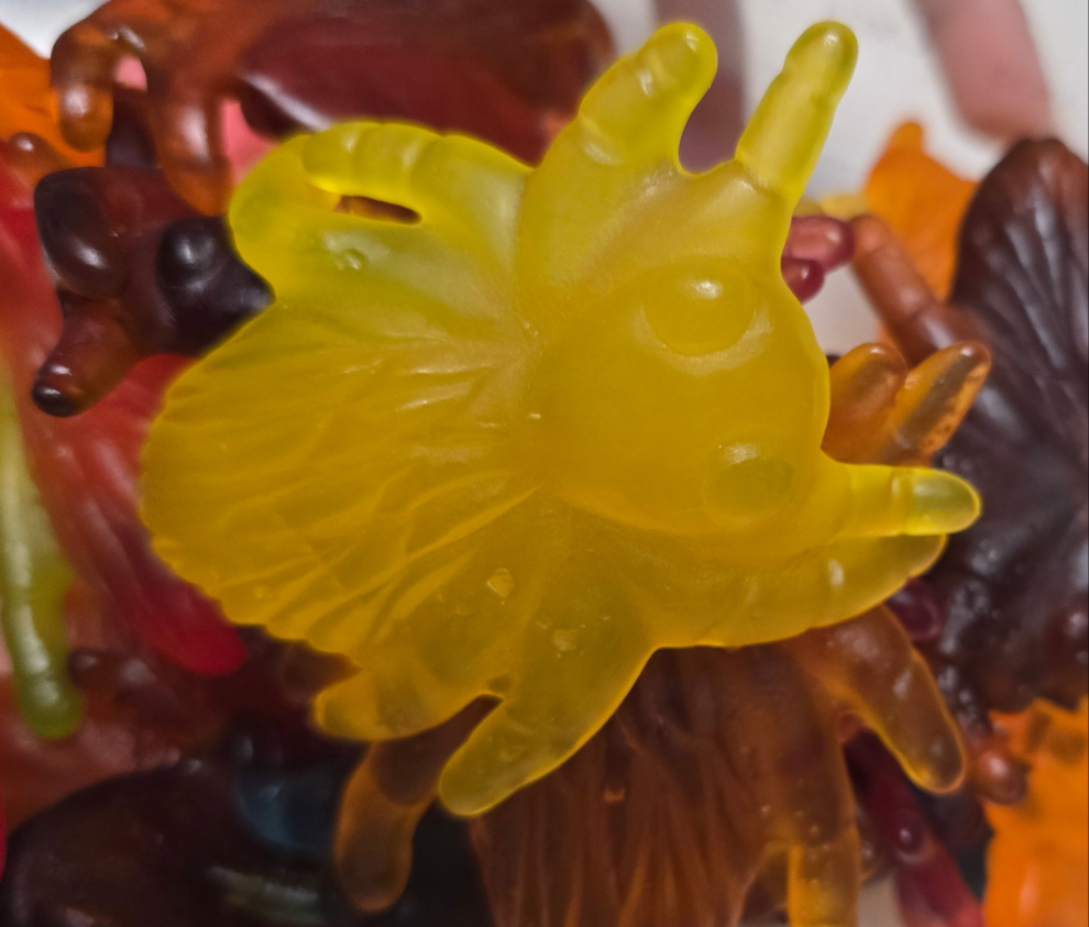Sirop de glucose, sucre, eau gélatine, acidifiant : acide citrique, arômes naturels, concentré, colorant de spiruline et de pomme, agent d'enrobage : cire de carnauba, huile de tournesol, colorants : caramel ordinaire, curcumine, anthocyanes extrait de paprika, arôme naturel d'agrumes, arômes naturel d'orange