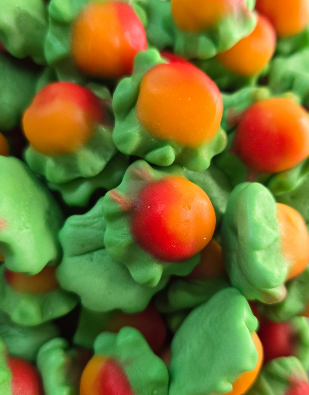 Sirop de glucose, sucre, eau, gélatine de boeuf halal, amidon modifié de pomme de terre, acidifiant ; E-270, E-330, agent d'enrobage : huile végétale (palme) E-901,E-903, arôme artificiel, colorants : E-100, E-129, E-133.