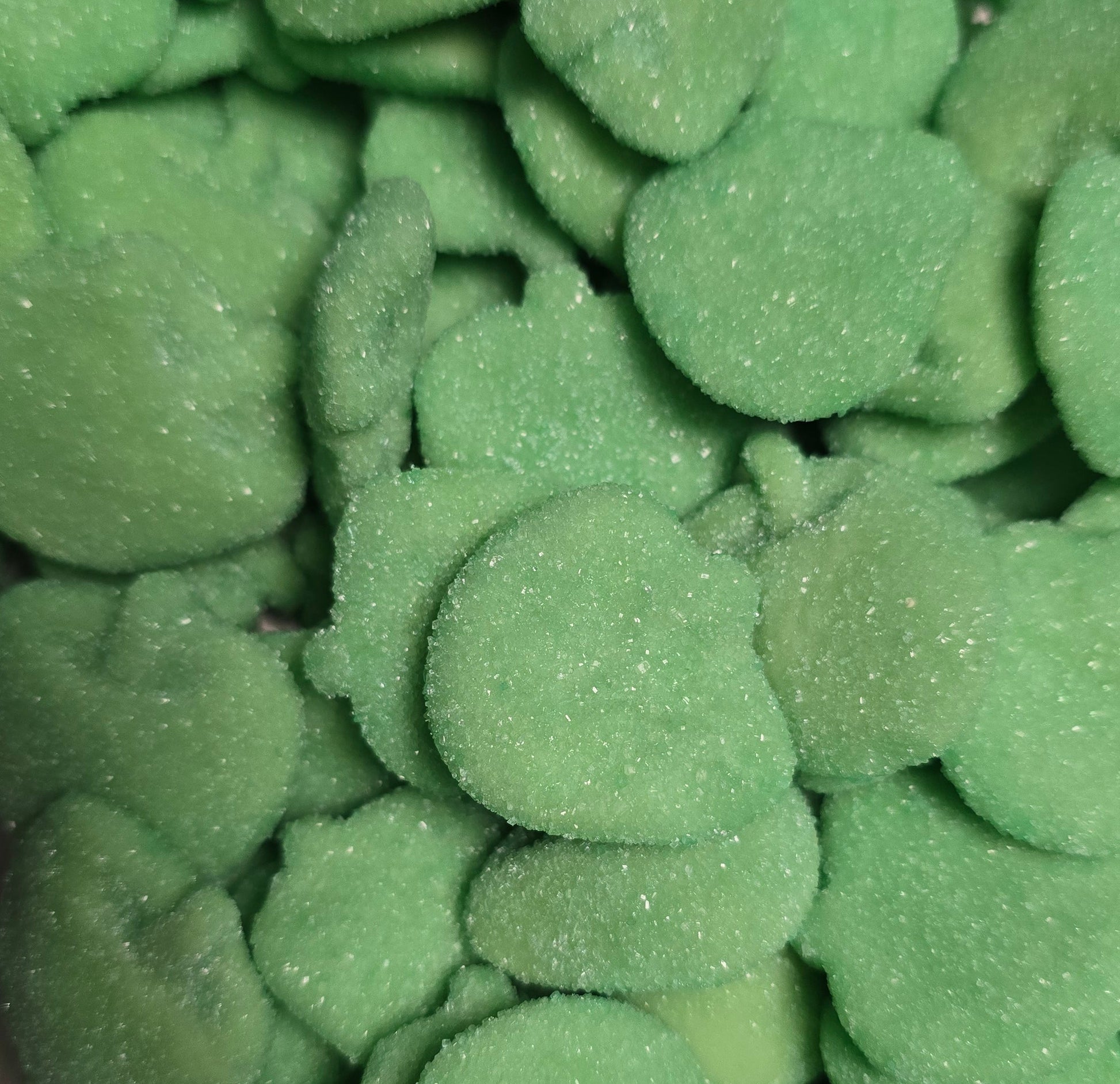 Sirop de glucose, sucre, eau, gélatine de bœuf halal, amidon modifié de pomme de terre, acidifiants (E270, E330), pectine, arôme artificiel, colorants (E100, E133).