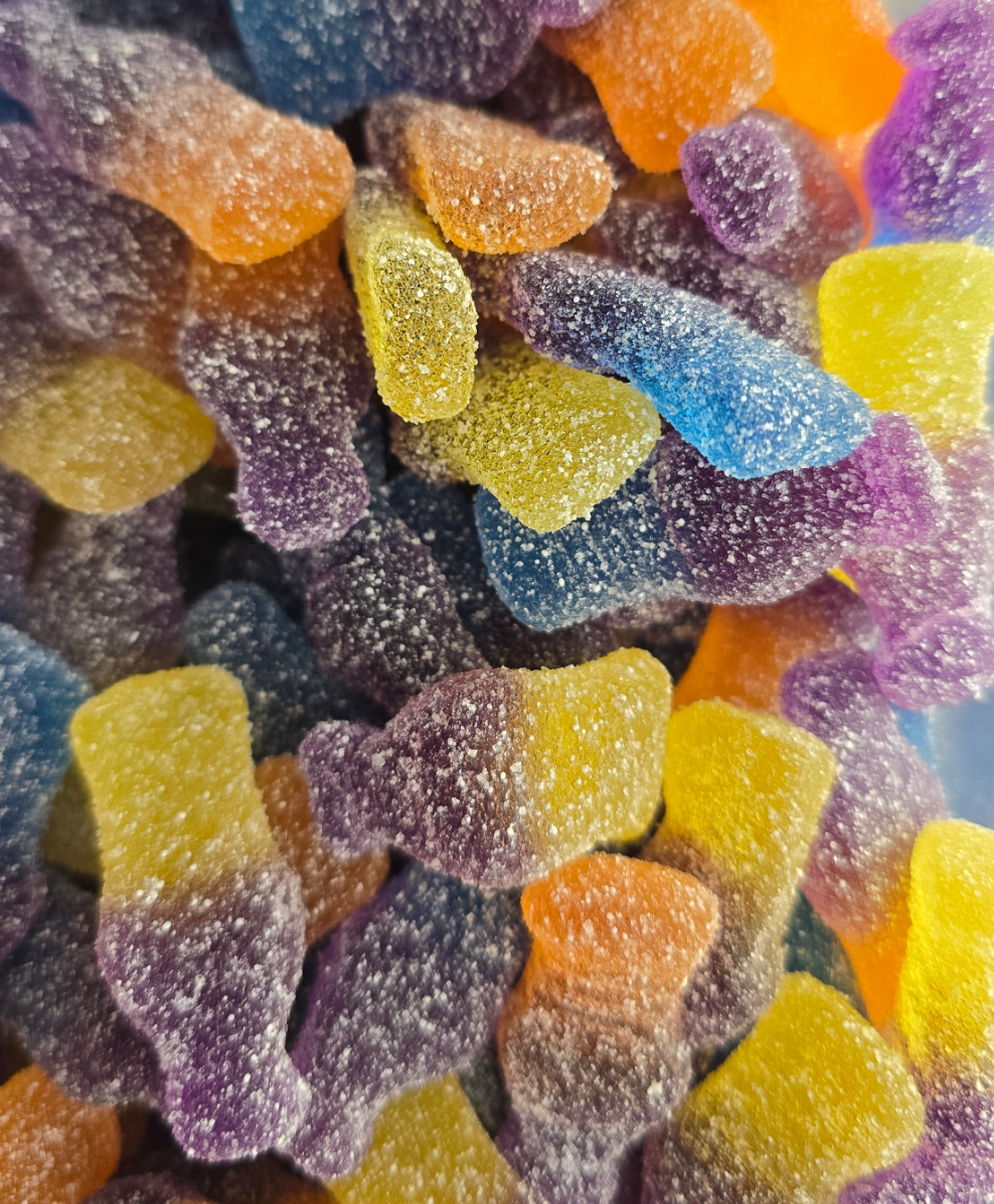 sirop de glucose, sucre, eau, gélatine, dextrose, acidifiant: acide citrique, acide malique, correcteur d'acidté: citrate tricalcique, malate acide de sodim: agent d'enrobage: cire de carnauba, arome: concentrés de fruits et de plantes, patate douce, radis, spiruline, carthame, pomme, colorants: carotèenes végétaux, anthocyanes